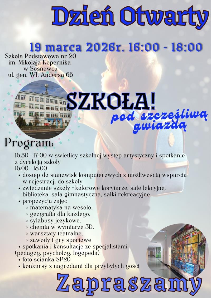 Szkoła Podstawowa nr 20 im. Mikołaja Kopernika w Sosnowcu to szkoła która zapewnia uczniom bezpieczne, przyjazne i inspirujące środowisko do nauki oraz wszechstronnego rozwoju. Szkoła wyróżnia się wysokim poziomem kształcenia, nowoczesnym podejściem do edukacji oraz troską o indywidualne potrzeby każdego ucznia.